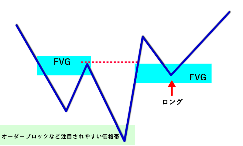 それでは早速、FVGを活用したトレード戦略の全体像から見ていきましょう。まずは、ロングエントリーのパターンについて解説します。