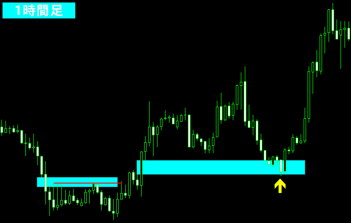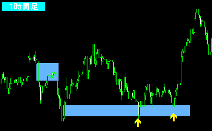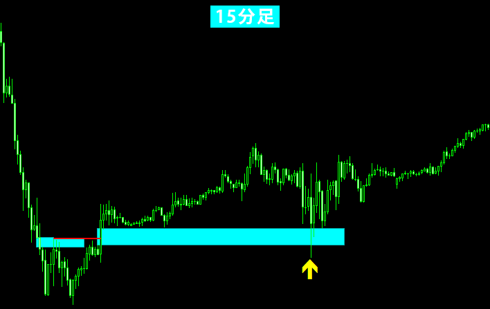 この例では、2つ存在するFVGのうち、下側のFVGで反転が起きました。