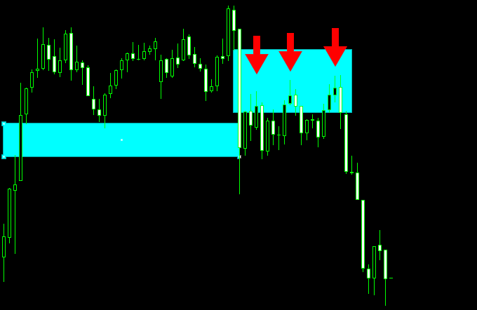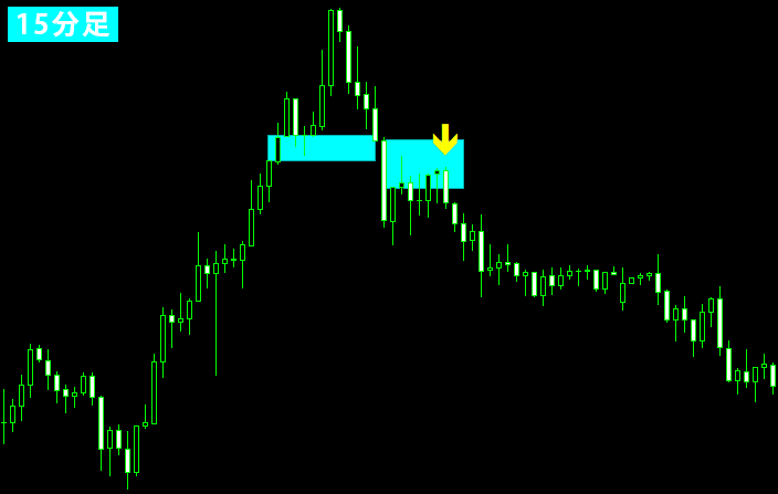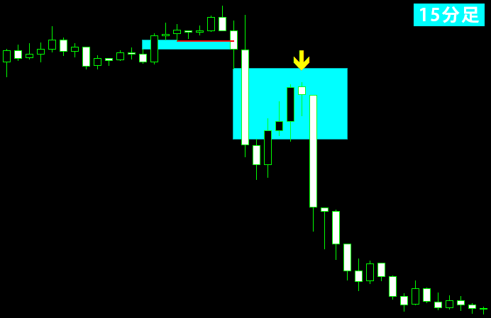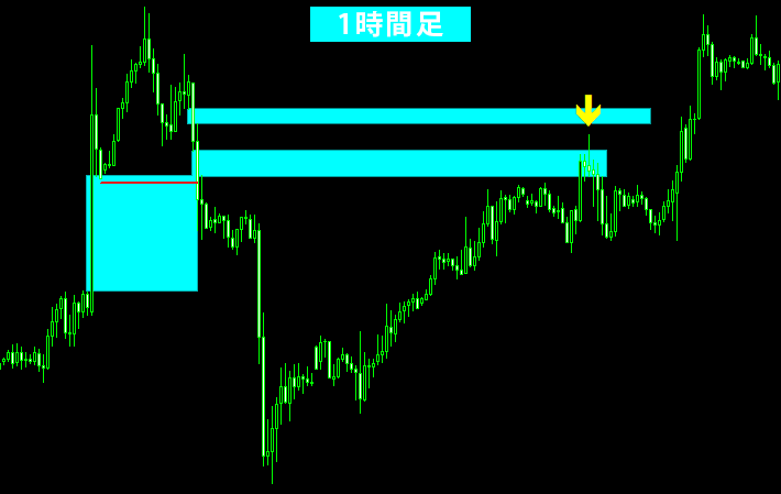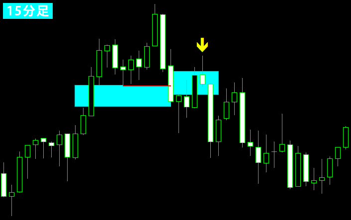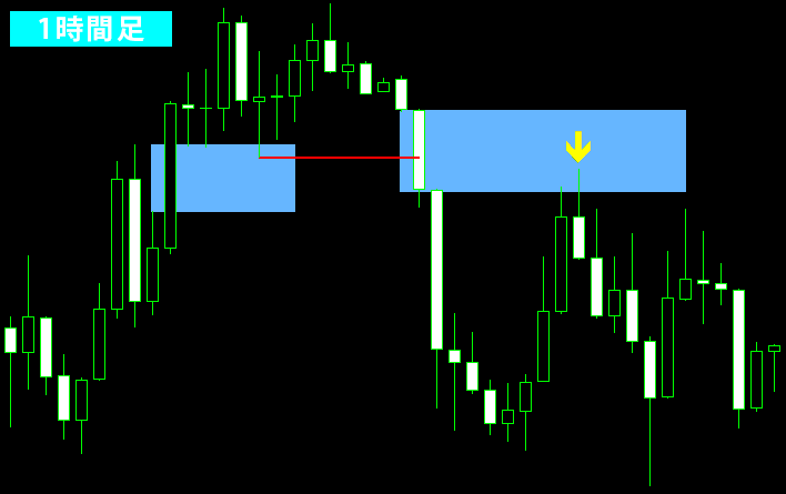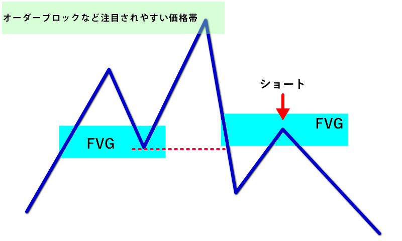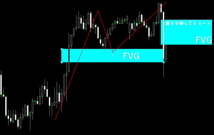 このように、わずかな戻しであってもFVGに入り込んだ時点で戻りと判断し、ここを戻り高値として捉えます。