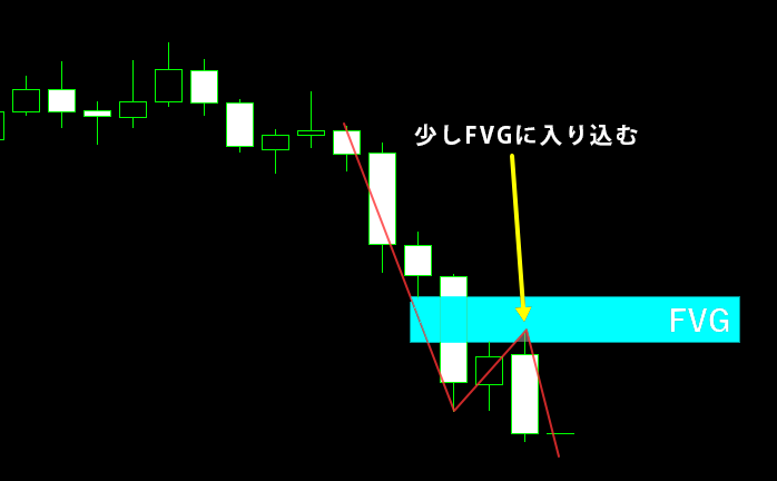 このチャートは下降トレンドの途中にあります。下落の過程でFVGが形成され、その次の足ではヒゲのみがFVG内に入り込みましたが、価格はそのまま安値を更新しています。