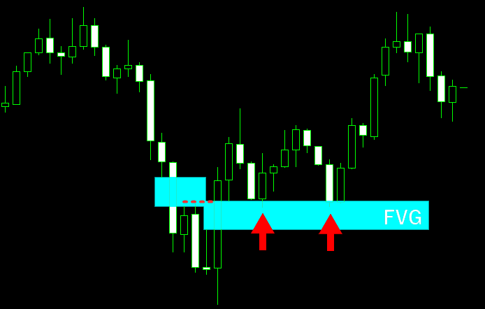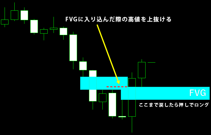 この過程において、下落局面と反発後の上昇局面の2か所でFVGが形成されていることが、エントリー条件となります。
