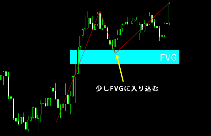 このチャートは上昇トレンドの途中にあります。上昇の過程でFVGが形成され、その後の押しで一度FVG内に入り込みましたが、価格はそこから再び高値を更新しています。