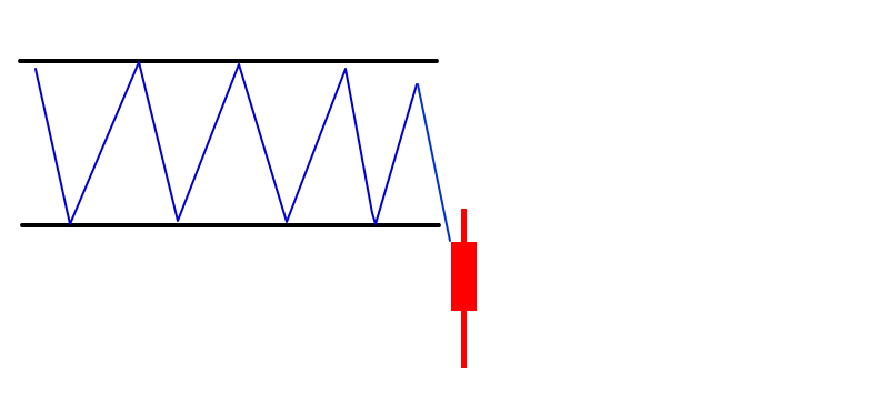 この動きによって、レンジ下に溜まっていた大量のストップ注文が発動し、一時的に流動性が急増します。それに伴い、価格も勢いよく下落します。