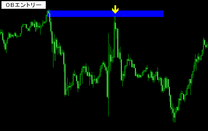 この一連の値動きの中で、ストップ狩りが行われた付近のローソク足の値幅が、オーダーブロックとして機能します。