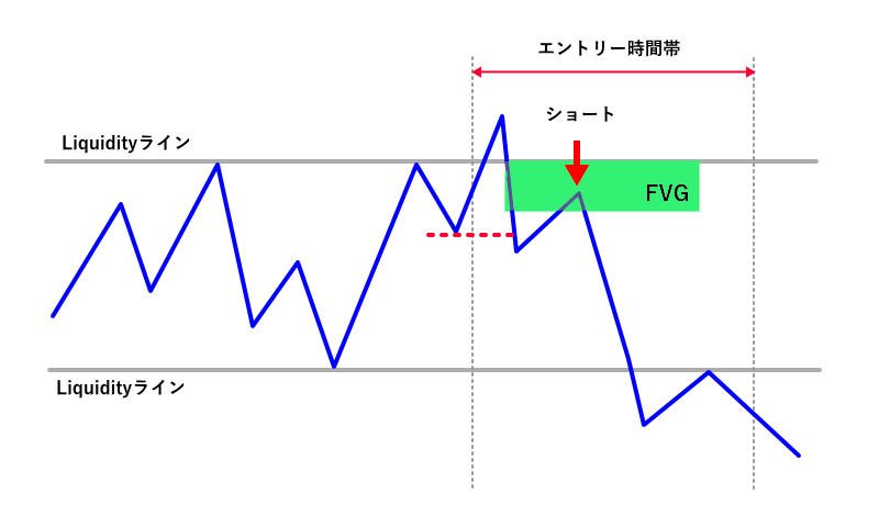 Liquidity Sweepの後に勢いよく反転する局面では、その反転の中で形成されるFVGを活用します。