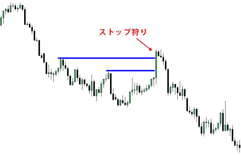 ストップ狩りとは、スマートマネーが目立つ高値や安値をあえてブレイクさせ、他のトレーダーの損切り注文を発動させる動きのことを指します。