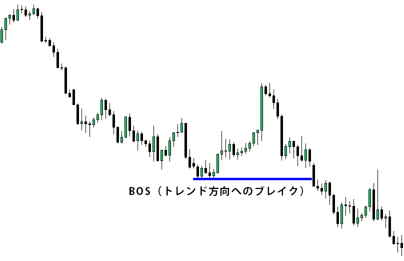一般的に、トレンド方向へ構造を更新するブレイクをBOS(Break of Structure)と呼び、反対方向へのブレイクをCHOCH(Change of Character)と呼びます。