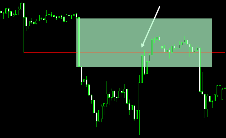 これを見ただけで気づいた方もいるかもしれませんが、FVGが形成される前の目立つ高値に赤いラインを引いています。
